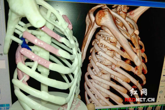 電焊工被重達數百公斤的鋼柱打中,造成7根肋骨骨折,每根肋骨斷成數截。湖南省人民醫院心胸外科采用3D打印技術確定骨折部位、明確手術切口,最終成功施行手術。國內外文獻查新顯示:“未見3D打印技術運用于肋骨骨折手術的報